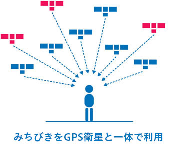 みちびきからGPSと同一周波数・同一時刻の測位信号を送信することにより、GPSと一体となって使用し、