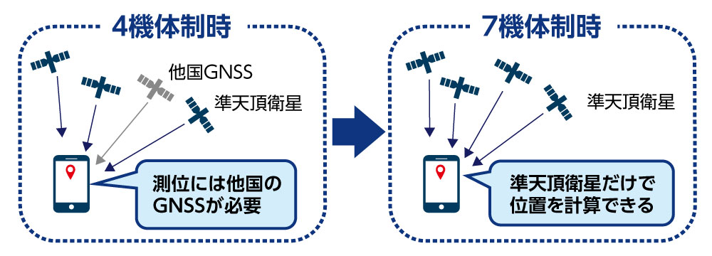 準天頂衛星システム(QZSS)「みちびき」の7機体制が確立すれば、他のGNSS(GPSなど)に依存せずに、みちびき単独で正確な測位が可能となります。